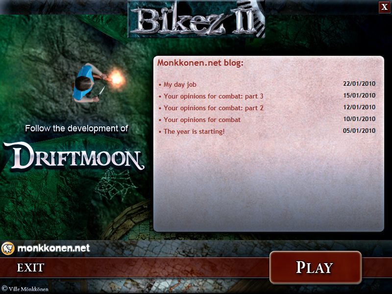 I spent the weekend working on a launcher screen for the monkkonen.net games. At first I will put it into my older games to advertise Driftmoon, and in Driftmoon I'm hoping to make it a config utility, mod selector and perhaps an autoupdater.